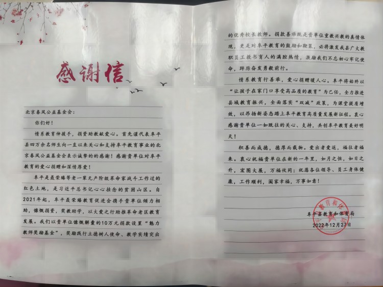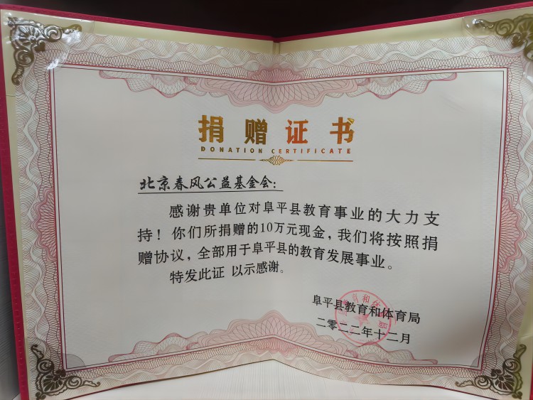 2022年,为了继续助推乡村振兴决策部署、支持老区教育事业发展,北京春风公益基金会再次落实了对阜平县教育和体育局的爱心捐赠活动。活动中我会向阜平县教育和体育局捐赠现金10万元,该笔专款将继续作为奖励金,颁发给获得“魅力教师奖”等公开荣誉的该县优秀教职人员。通过反馈和调研得知,该县政府对奖项、奖金设立、研判和颁发有依可据,流程合理,符合公平、公正的原则,我会对阜平的实际支持,向全县全体师生传递了尊师重教的正能量,在当地取得了良好口碑和热烈反响。